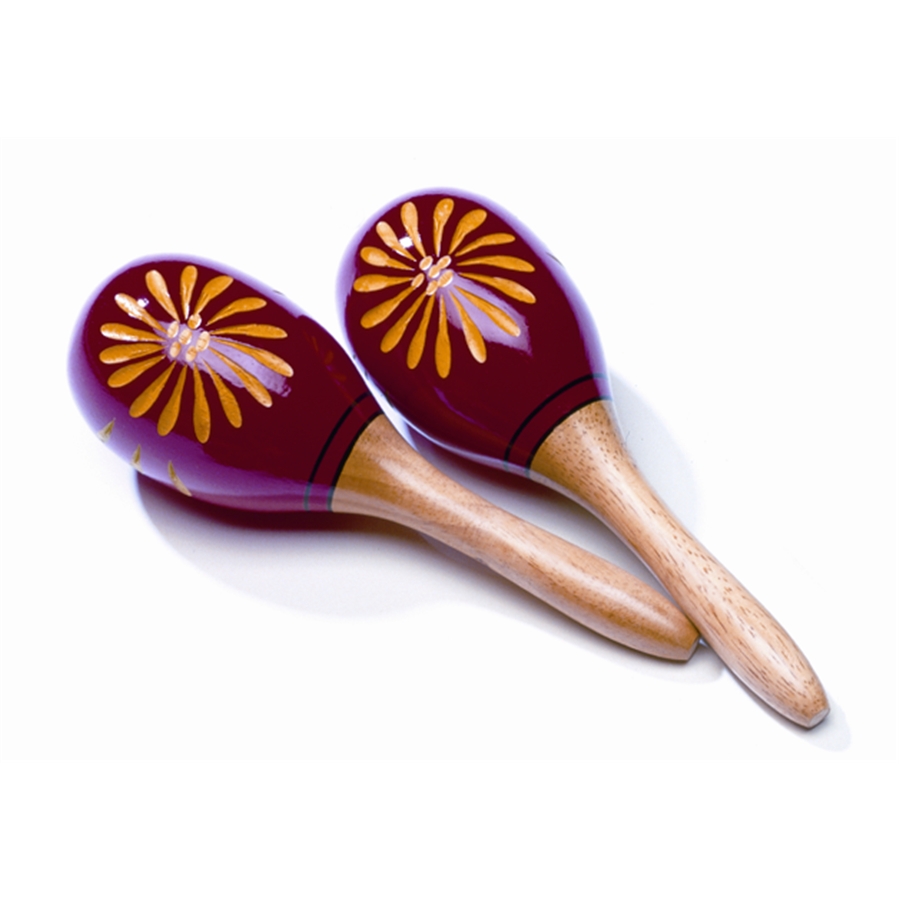 Queste maracas sono costruite in legno, di colore nero, con sopra disegnato un motivo colorato. Diametro 8 cm, Lunghezza 25 cm.