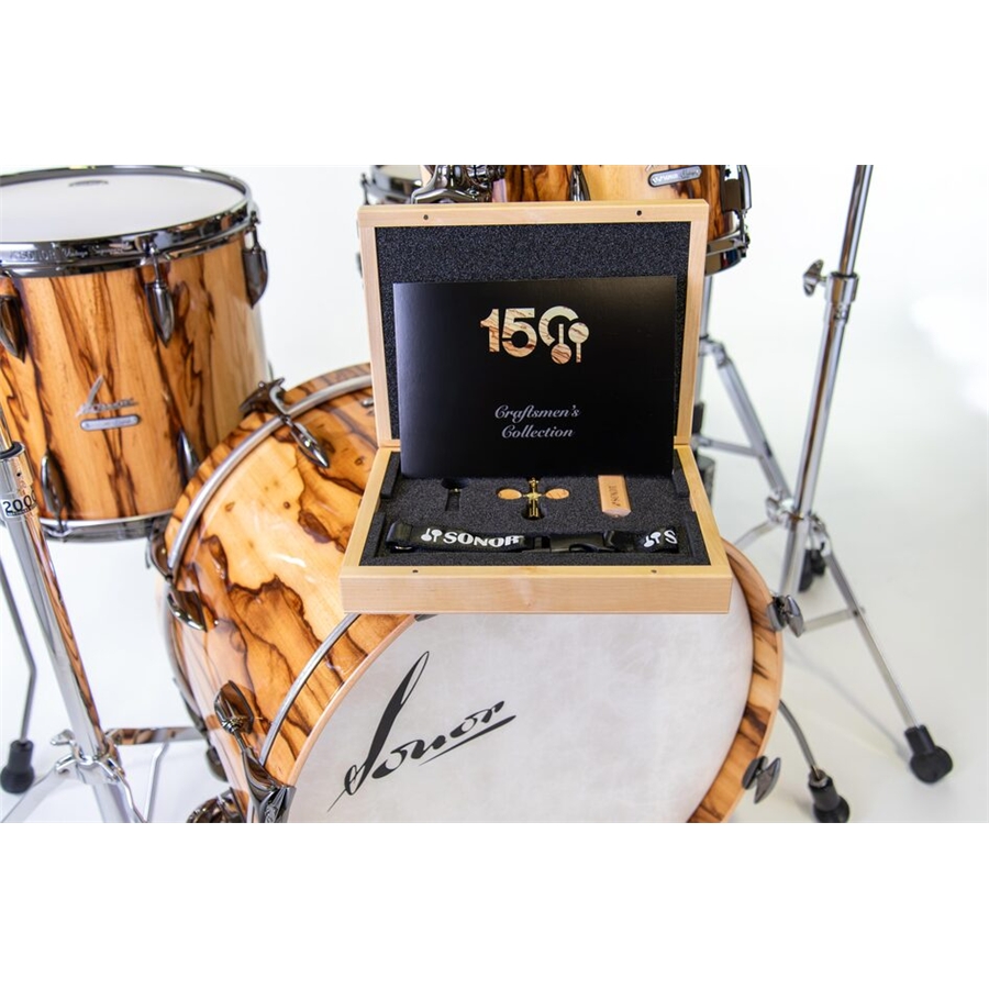 Craftsmen’s Collection Vintage Shell Set: Edizione limitata 150° anniversario: solo 100 kit nel mondo. Fusti 9 strati (acero + radica africana), finitura lucida a mano, bordature tonde, hardware placcato rutenio. Inclusi certificato numerato e rullante dedicato.