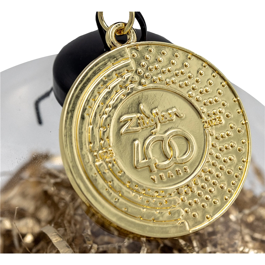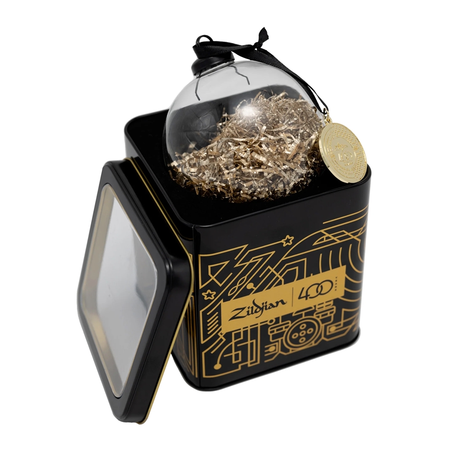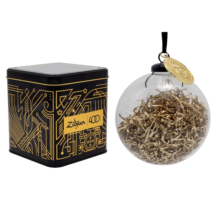 - Ornamento in vetro riempito con autentici trucioli di piatti in lega Zildjian - Confezione commemorativa in latta inclusa - Dettaglio ciondolo logo 400° anniversario - Appendino in nastro nero - La sfera di vetro ha un diametro di 4" (100 mm)